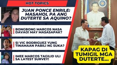 HOT TOPICS 1. Juan Ponce Enrile shared his thoughts on what might happen if the Dutertes don't stop. 2. President Bongbong Marcos is now in Davao. What’s next? 3. Vic Rodriguez is the most affected by what BBM said about “pinabili lang ng suka.” 4. Imee Marcos is still down in the latest survey. Can… Read more